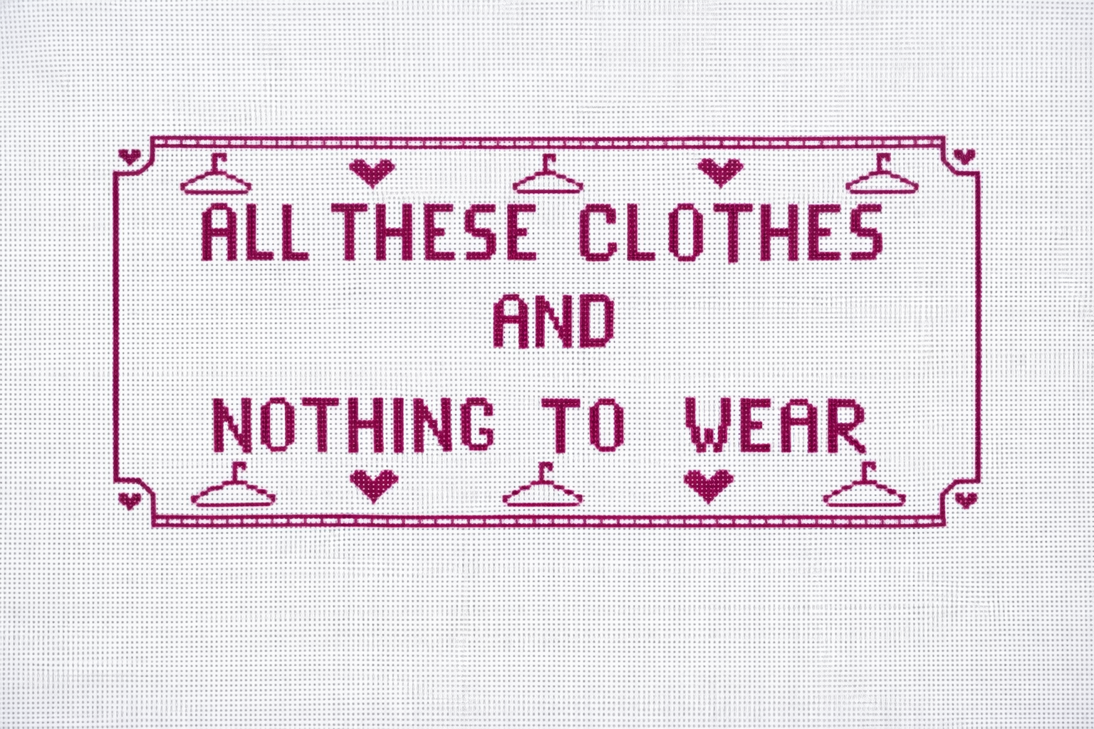 Shop › All These Clothes and Nothing to Wear Needlepoint Canvas Image 1 of 2 Image 2 of 2 All These Clothes and Nothing to Wear Needlepoint Canvas $73.00 18 mesh, 8 × 13 white canvasDesign: 9.5 x 4.5 Add To Cart Added! 18 mesh, 8 × 13 white canvasDesign: 9.5 x 4.5